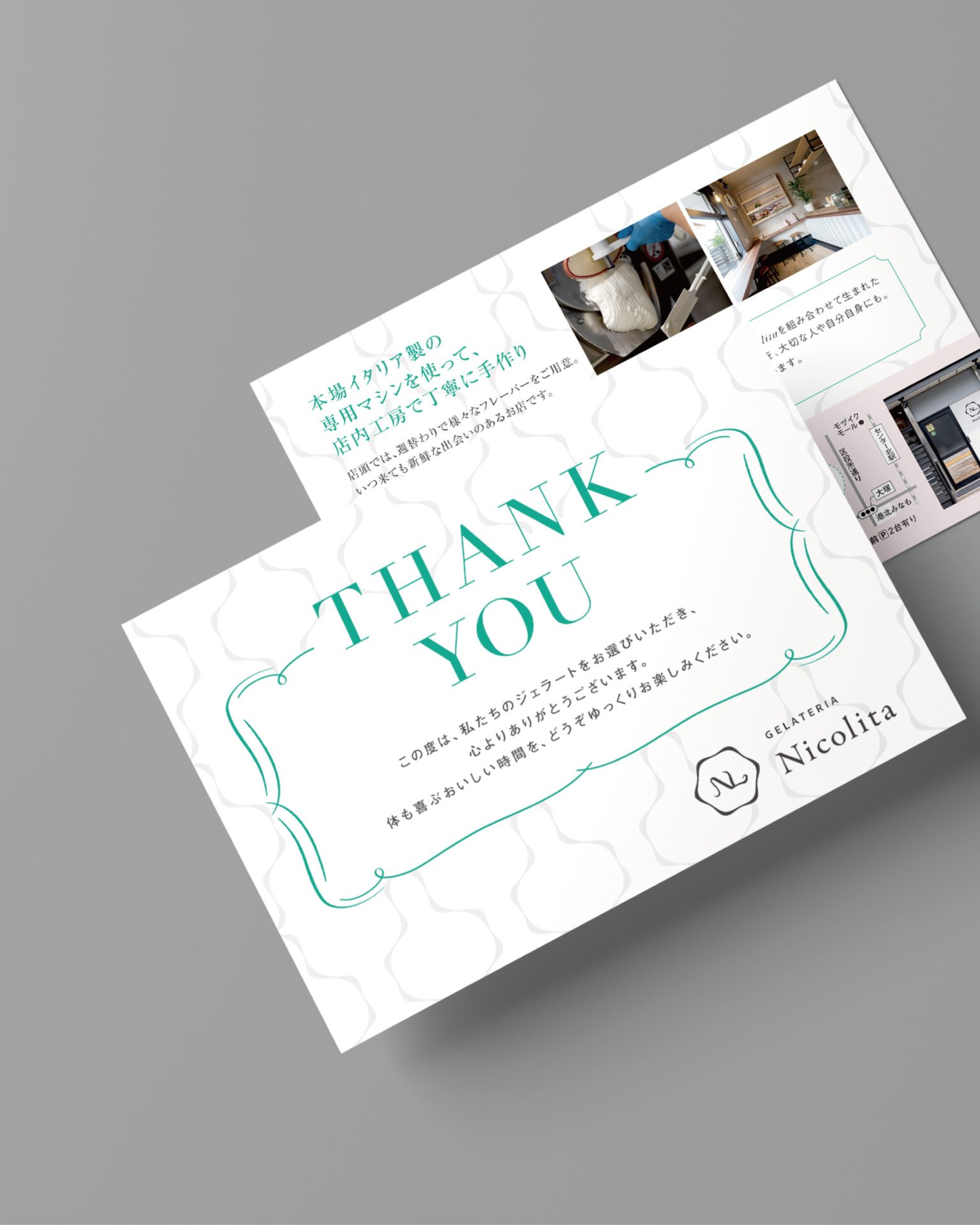 横浜市都筑区の地産地消ジェラート専門店「Nicolita(ニコリータ)」様のA5二つ折りサンキューカードをデザインを担当させていただきました。