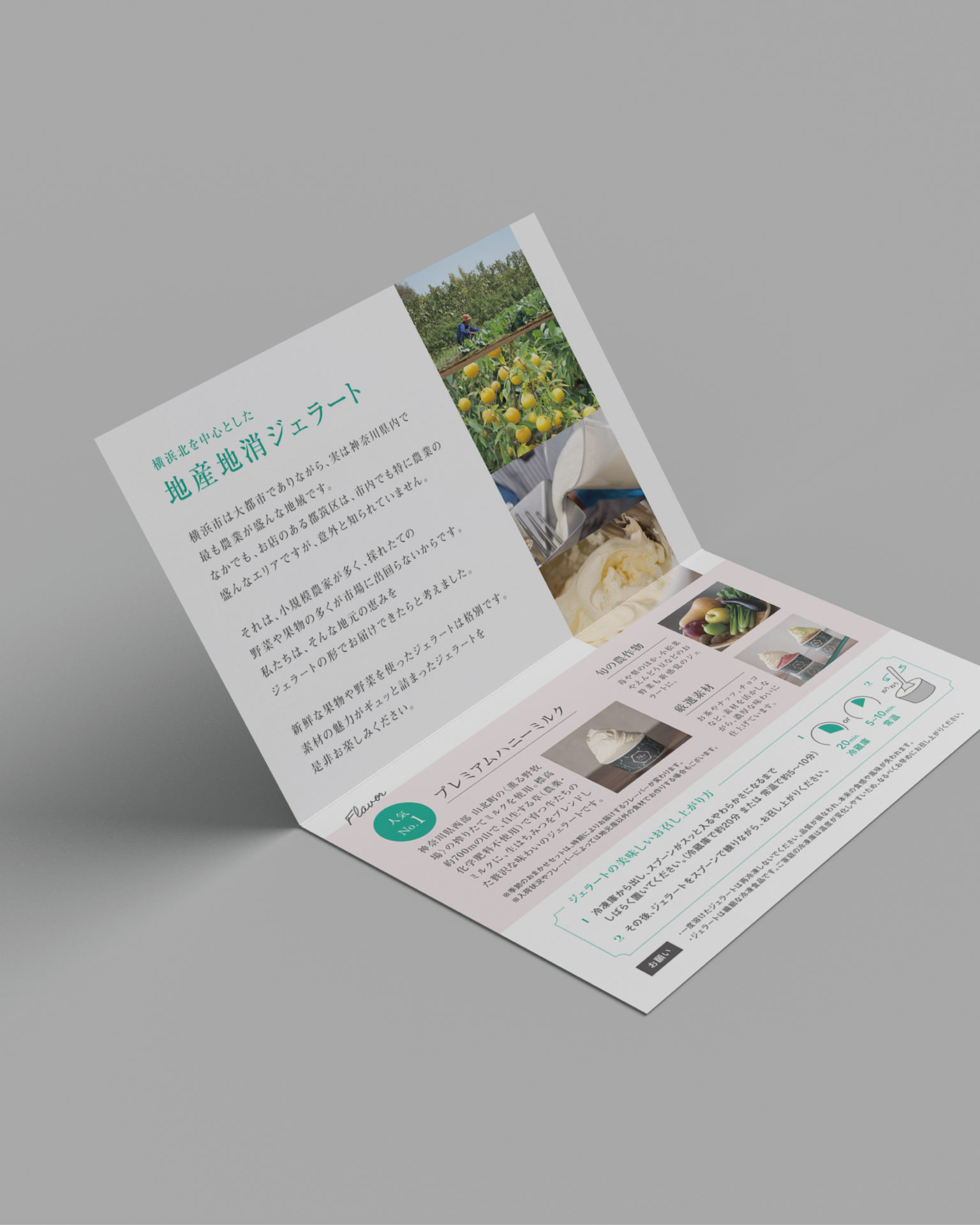 中面には、お店のこだわりやジェラートの美味しいお召し上がり方を掲載。お店の想いや背景まで伝わる、内容の詰まった一枚となっています。商品や店舗写真は撮影ディレクションさせていただいたものを使用。オンラインショップ開設に向け、撮影も行い、撮影ディレクションも担当いたしました。