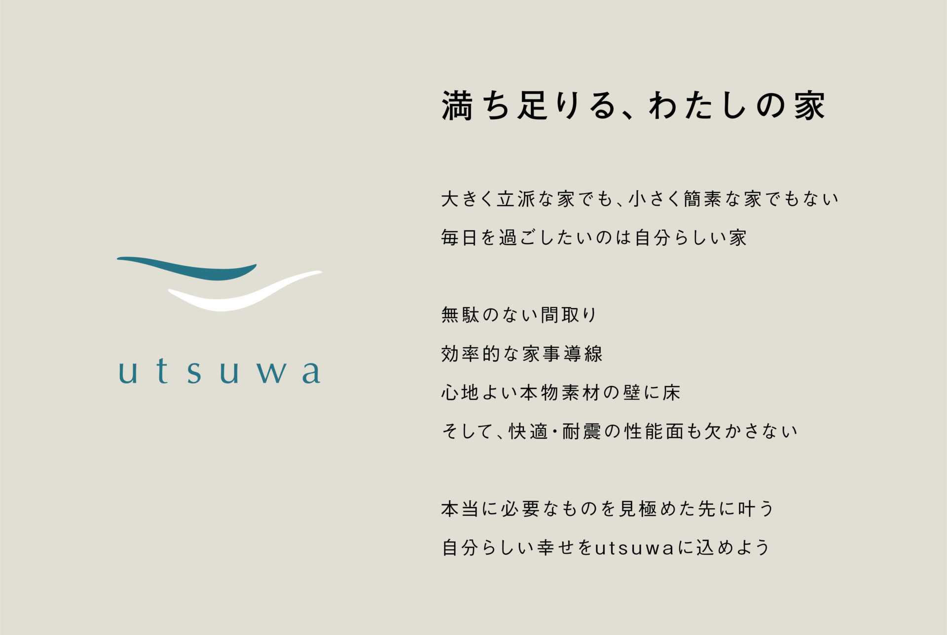 utsuwaは、コンセプトハウスでありながら、住まう人のこだわりが感じられる一邸を実現できる住宅です。高品質はそのままに、手の届きやすい価格を実現。「住まう人それぞれの幸せを表現できる器のような包容力」「住まいに表れる個性」「足るを知る心からくる満足感」といったワードを選定の上、ブランドキャッチコピー〈満ち足りる、わたしの家〉を開発しました。